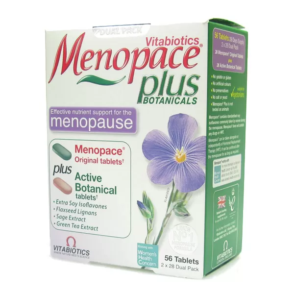 Το Menopace Plus της Vitabiotics είναι μια διπλή συσκευασία που περιλαμβάνει τις ταμπλέτες Menopace μαζί με δραστικές ταμπλέτες βοτάνων με φυτοοιστρογόνα για γυναίκες που υποφέρουν σε μεγάλο βαθμό από τα συμπτώματα της εμμηνόπαυσης και επιζητούν μια πιο δραστική ενίσχυση του οργανισμού τους.