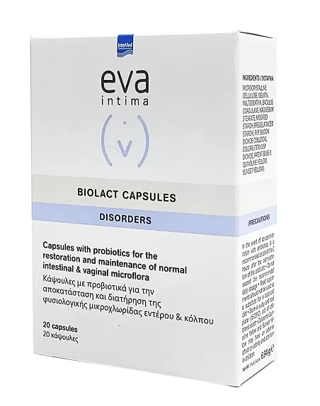 Το προβιοτικό Eva Biolact Capsules με τους ωφέλιμους μικροοργανισμούς (γαλακτοβάκιλλους) που προσφέρει, αποκαθιστά άμεσα και προλαμβάνει αποτελεσματικά τις διαταραχές της φυσιολογικής χλωρίδας του εντέρου, του κόλπου και της ευαίσθητης περιοχής της γυναίκας που μπορεί να οφείλονται σε οποιαδήποτε αιτία όπως λήψη αντιβιοτικών, κολπίτιδες κ.α.