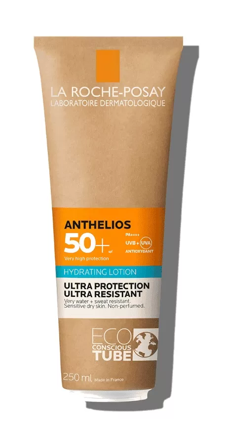 ANTHELIOS ECO-CONSCIOUS HYDRATING LOTION SPF 50+. Η 1η ultra υψηλή UVA προστασία με περισσότερο σεβασμό στο πλανήτη. Αυτό είναι το πρώτο αντηλιακό Anthelios που ενσωματώνει χαρτόνια στη παραγωγή του σωληναρίου ώστε να μειώσει το πρωτογενές πλαστικό κατά 45% *.