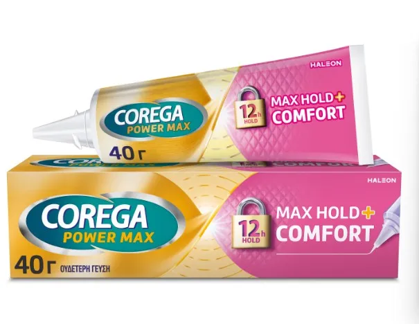 Η νέα Corega Power Max Hold + Comfort προσφέρει πιο δυνατό κράτημα και συγκράτηση στην τεχνητή οδοντοστοιχία ενώ χάρη στο συστατικό καρβομερές (carbomer) δημιουργεί μια προστατευτική στρώση μειώνοντας τα σημεία τοπικής πίεσης και παρέχοντας μεγαλύτερη άνεση.