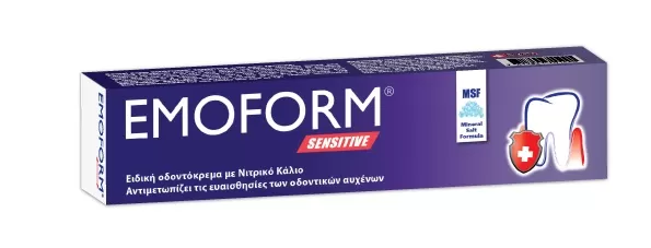 Περιέχει Νιτρικό Κάλιο (5%), ενεργό συστατικό κλινικά δοκιμασμένο και αναγνωρισμένο από το FDA, σαν ασφαλές και αποτελεσματικό στην απευαισθητοποίηση των δοντιών και των απογυμνωμένων αυχένων στο ζεστό-κρύο, γλυκό-ξινό, στην επαφή με την οδοντόβουρτσα ή κάποιο άλλο οδοντιατρικό εργαλείο. Με πολύ χαμηλό δείκτη αποτριβής και ελαφρώς αλκαλικό pH για ήπιο καθαρισμό των δοντιών και των οδοντικών αυχένων. Χρησιμοποιείτε καθημερινά την EMOFORM SENSITIVE αντί της συνηθισμένης σας οδοντόκρεμας, σε συνδυασμό με μια σωστή τεχνική βουρτσίσματος και μια καλή οδοντόβουρτσα.