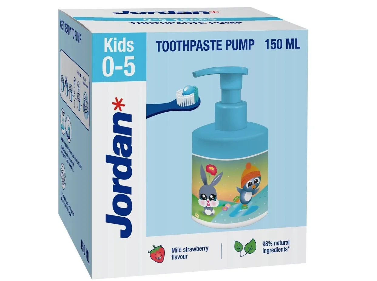 Γι’ αυτό δημιουργήσαμε την παιδική οδοντόκρεμα Jordan με Αντλία για Παιδιά 0-5 Χρονών με γεύση φρούτων 150ml και 500ppm όσο συστήνουν ο Διεθνής Οργανισμός Παιδοοδοντιατρικής & η Ευρωπαϊκή Ακαδημία Παιδοοδοντιατρικής.