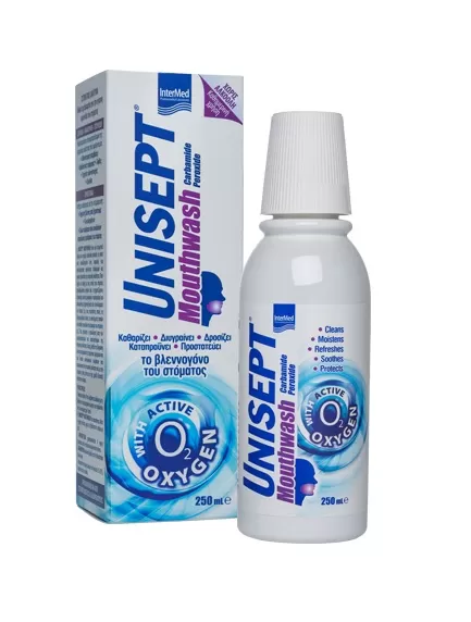 Το Unisept Mouthwash είναι μοναδικά σχεδιασμένο καθημερινό στοματικό διάλυμα, το οποίο χάρη στο ενεργό οξυγόνο προσφέρει πολλαπλή δράση:αντιμικροβιακή, καθαριστική, επουλωτική, ανακουφιστική και συμβάλει με τον τρόπο αυτό στην καθημερινή υγιεινή φροντίδα & την αντισηπτική προστασία του στόματος ενώ παράλληλα επουλώνει και ανακουφίζει από τον πόνο που μπορεί να προκαλέσουν άφθες, έλκη & πληγές της στοματικής κοιλότητας οποιασδήποτε αιτιολογίας