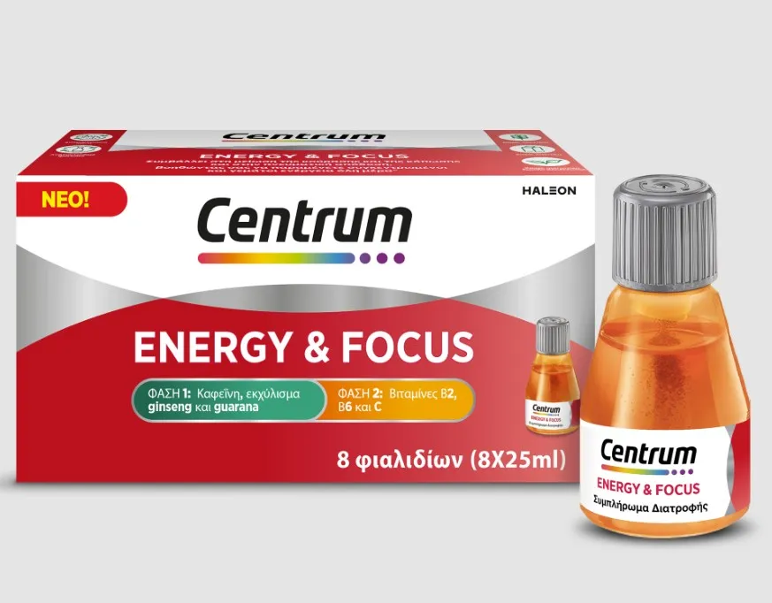 Το CENTRUM ENERGY & FOCUS είναι ένα συμπλήρωμα διατροφής για ενήλικες που διαθέτει ένα μοναδικό μείγμα βιταμινών, εκχυλίσματος ginseng και guarana και καφεΐνης.
