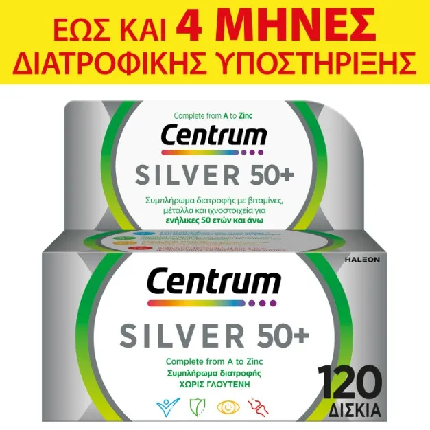 Το Centrum Silver 50+ είναι ένα συμπλήρωμα διατροφής με προσαρμοσμένα επίπεδα βιταμινών, μετάλλων και ιχνοστοιχείων, ώστε να ανταποκρίνεται στις διατροφικές ανάγκες των ενηλίκων 50 ετών και άνω. Εύκολο στη λήψη, όπου και όποτε το χρειαστείτε. Κατάλληλο για ενήλικες, άνδρες και γυναίκες.