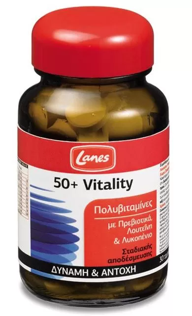 Η πολυβιταμίνη Vitality 50+ προσφέρει έναν καινοτόμο συνδυασμό βιταμινών & μετάλλων ενισχυμένο με έξτρα συστατικά και είναι ειδικά σχεδιασμένη για τις αυξημένες ανάγκες των ατόμων άνω των 50 ετών. Η πλήρης και ισορροπημένη σύνθεσή του αναπληρώνει διατροφικές ελλείψεις και συμβάλλει στη διατήρηση της φυσιολογικής λειτουργίας του οργανισμού ενισχύοντας το αμυντικό σύστημα και προσφέροντας ενέργεια, ζωτικότητα και αντοχή. Χάρη στις φυτικές ίνες ινουλίνης (πρεβιοτικά) μεγιστοποιείται η απορρόφηση των θρεπτικών συστατικών από τον οργανισμό, ενώ η προσθήκη της λουτεΐνης και του λυκοπένιου που έχουν ισχυρή αντιοξειδωτική δράση, συμβάλλουν στην αδρανοποίηση των ελεύθερων ριζών.
