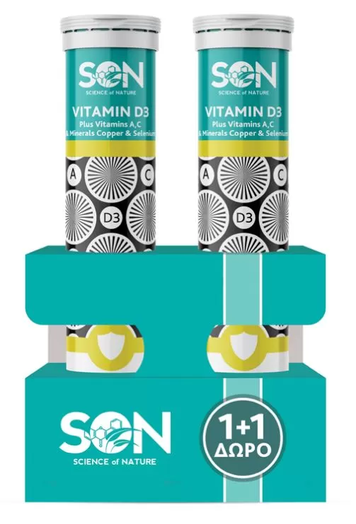 Το SON VITAMIN D3 περιέχει βιταμίνες Α, C, D3 ιχνοστοιχεία Σελήνιο (Se) και Χαλκό (Cu) που συμβάλλουν στη φυσιολογική λειτουργία του ανοσοποιητικού συστήματος.
