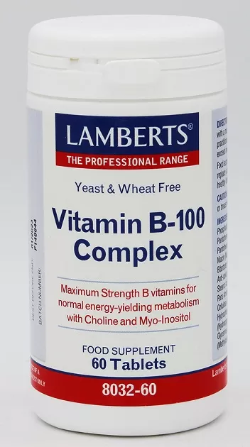 To B-100 Complex της Lamberts, αποτελεί μια εξειδικευμένη διατροφική φόρμουλα υψηλής ισχύος που παρέχει το σύνολο των βιταμινών του συμπλέγματος Β. Αρκετές από τις βιταμίνες του συμπλέγματος Β συμβάλλουν: